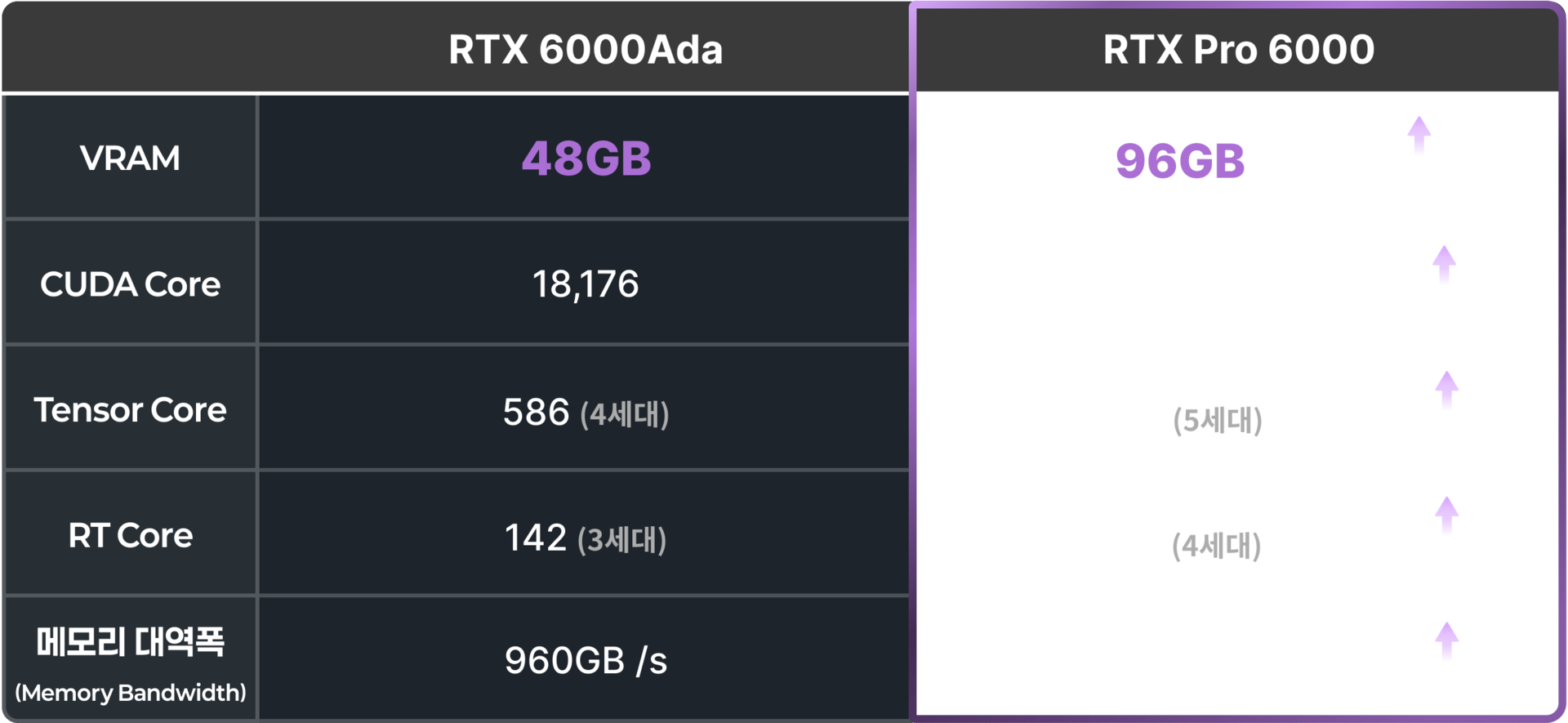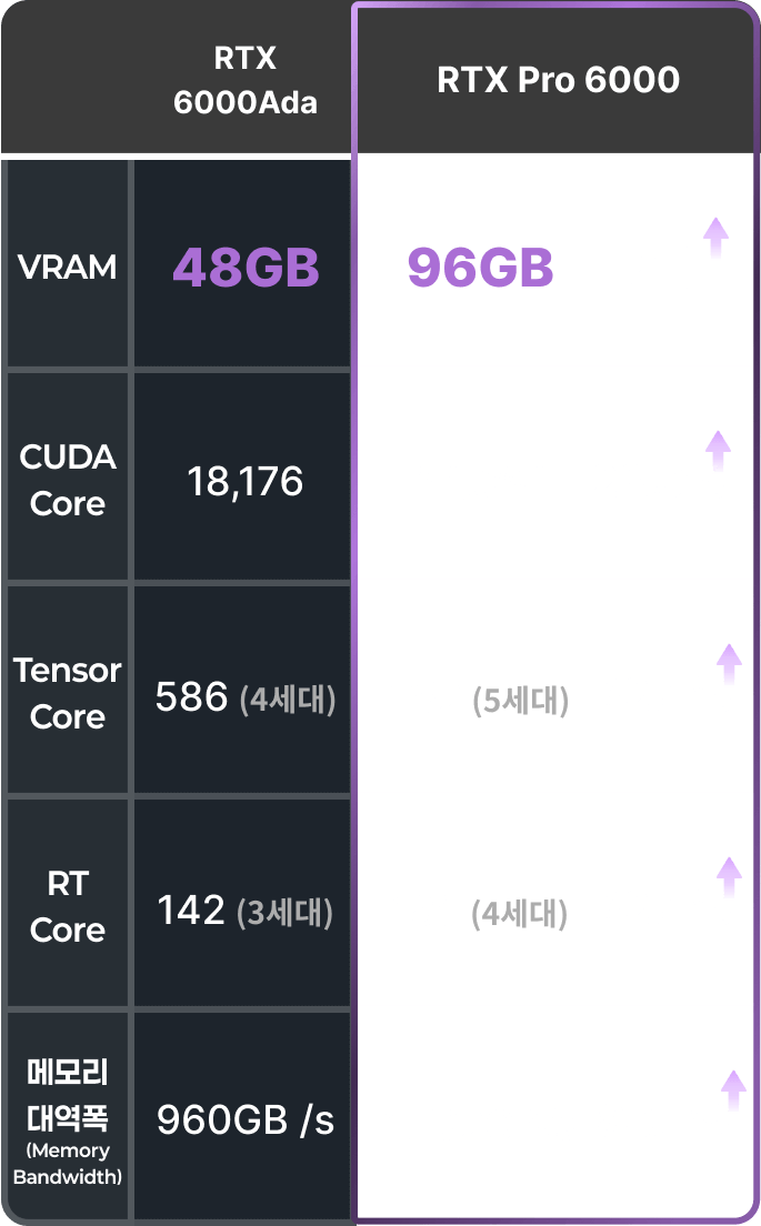• pro 6000 VRAM 은 96GB, 메모리 대역폭은 1,792GB/s 으로 대규모 모델도 메모리 제약 없이 안정적으로 학습합니다.